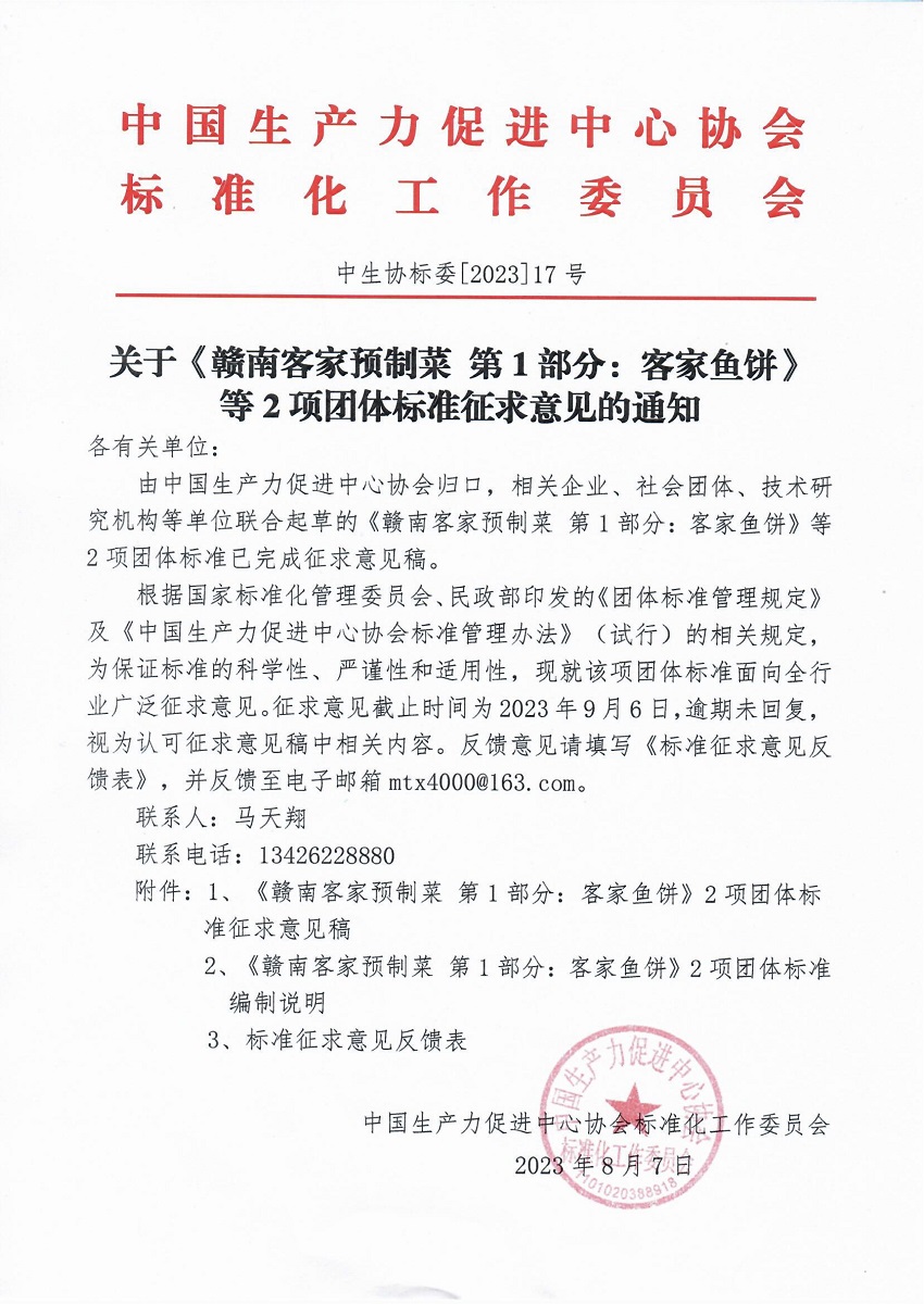 关于《赣南客家预制菜 第1部分:客家鱼饼》等2项团体标准征求意见的通知
